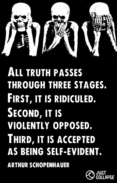 Collapse is inevitable. Having passed through the first of Schopenhauer’s three stages, this dawning reality will likely meet with violent opposition before it is recognised as self evident. #TalkCollapse for socio-ecological justice. Talk collapse for a #JustCollapse.