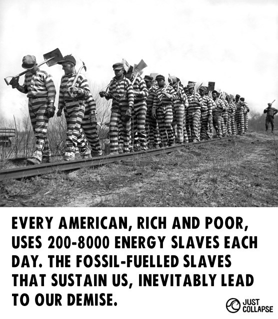 89 million barrels of oil are used every day. This equates to 14,000 years of fossilised sunshine and 765 million years’ worth of human labour in just one day. These invisible energy slaves cannot be replaced through a ‘renewables’ transition or entirely ameliorated through intentional degrowth. Collapse is inevitable. Justice is not. Act now for a #JustCollapse.