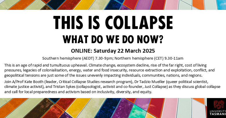 VIDEO: This is Collapse – this groundbreaking event attracted 600 registrations from around the world. Calling for local preparedness and action, A/Prof Kate Booth, Dr Tadzio Mueller, and Tristan Sykes #TalkCollapse for a #JustCollapse!