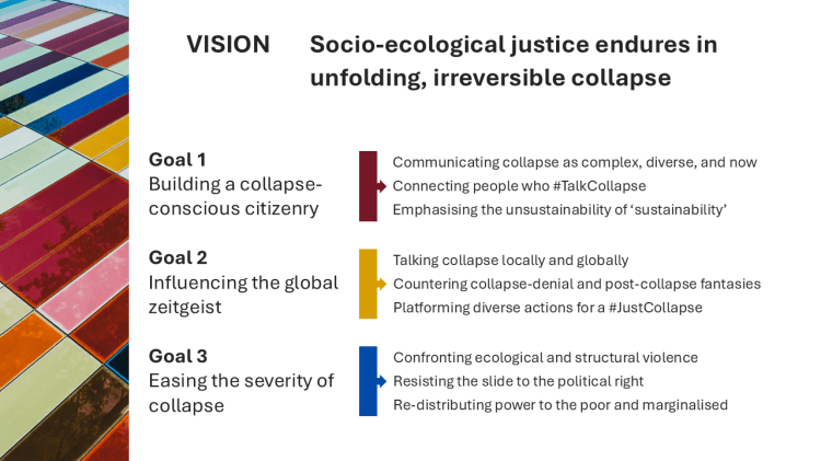 Now, with more and more people talking collapse, we are collectively changing the shape, character, and direction of the spirit of our times. Doing so ensures a basis upon which we will achieve as much socio-ecological justice as possible within the complex realities and horrors that collapse entails – working together for a Just Collapse.